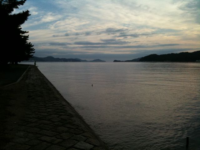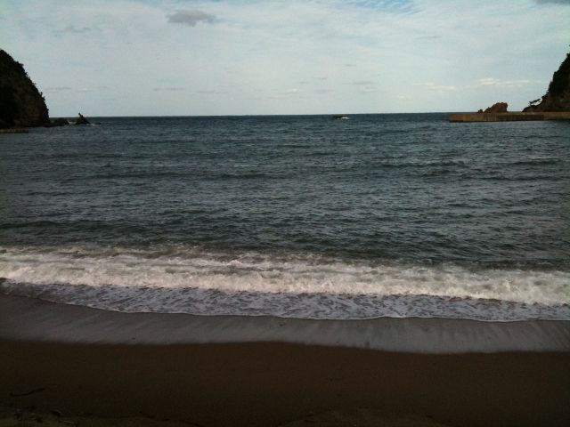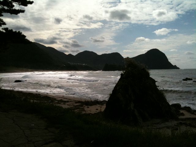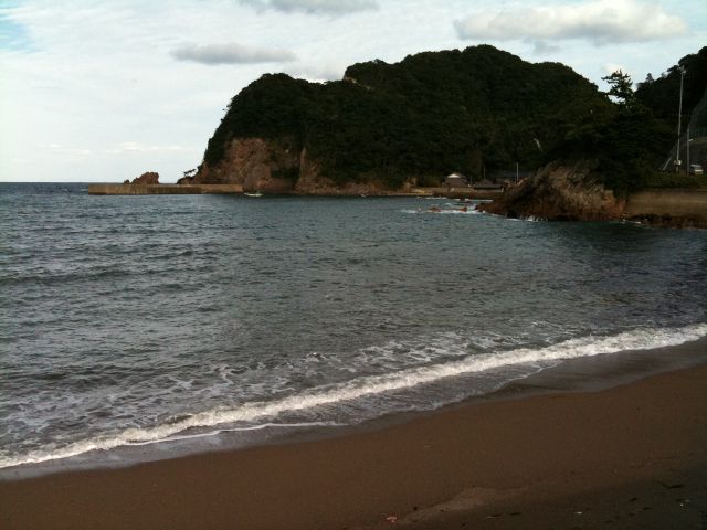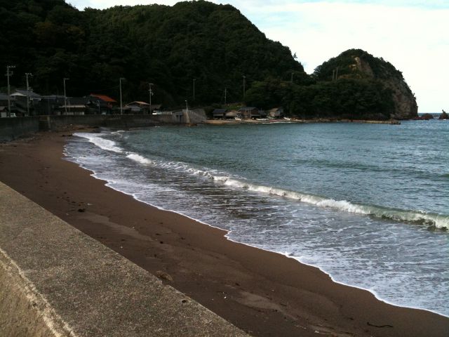 高嶋到着。 駐車場から坂を少し下りると浜に出た。
