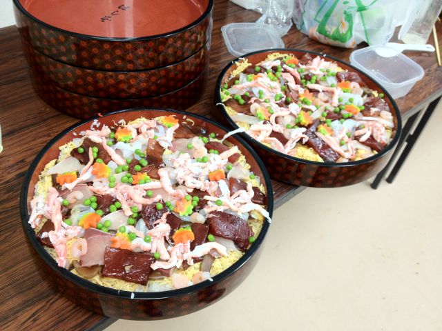 宴会でいっぱいお話してくれたエボさん渾身の超豪華ちらし寿司。