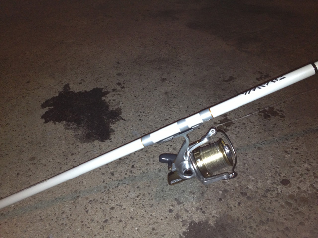 急いで戻ってさっそく遠投!・・・が、ひょいと軽く投げてまた車に戻る私。「フィンガープロテクター忘れました・・・」